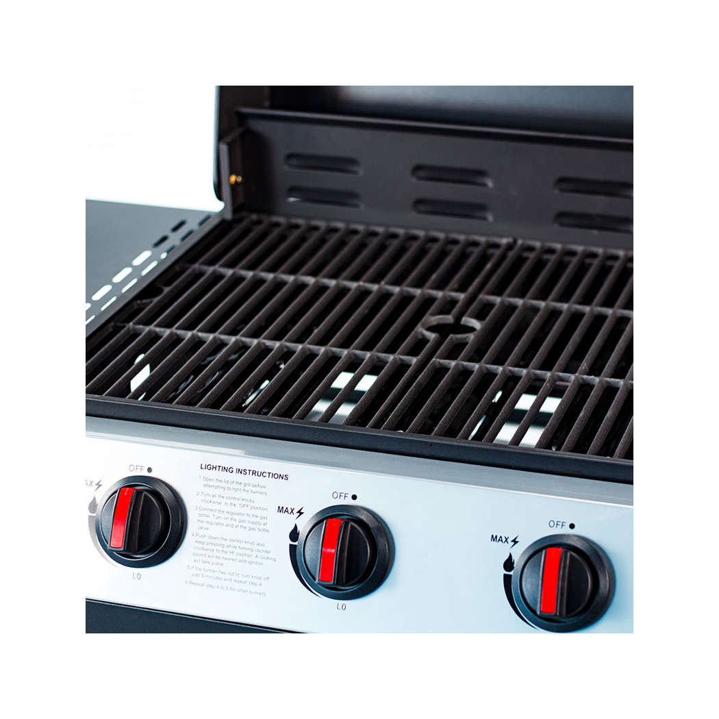 Ψησταριά Υγραερίου ELEMENT,3 εστιών από την BORMANN, με μαντεμένια σχάρα, ρόδες για εύκολη μεταφορά και μεγάλο θερμόμετρο στο καπάκι. Επίσης διαθέτει 2 ράφια στις πλευρές και πιεζοηλεκτρικό άναμμα εστιών.