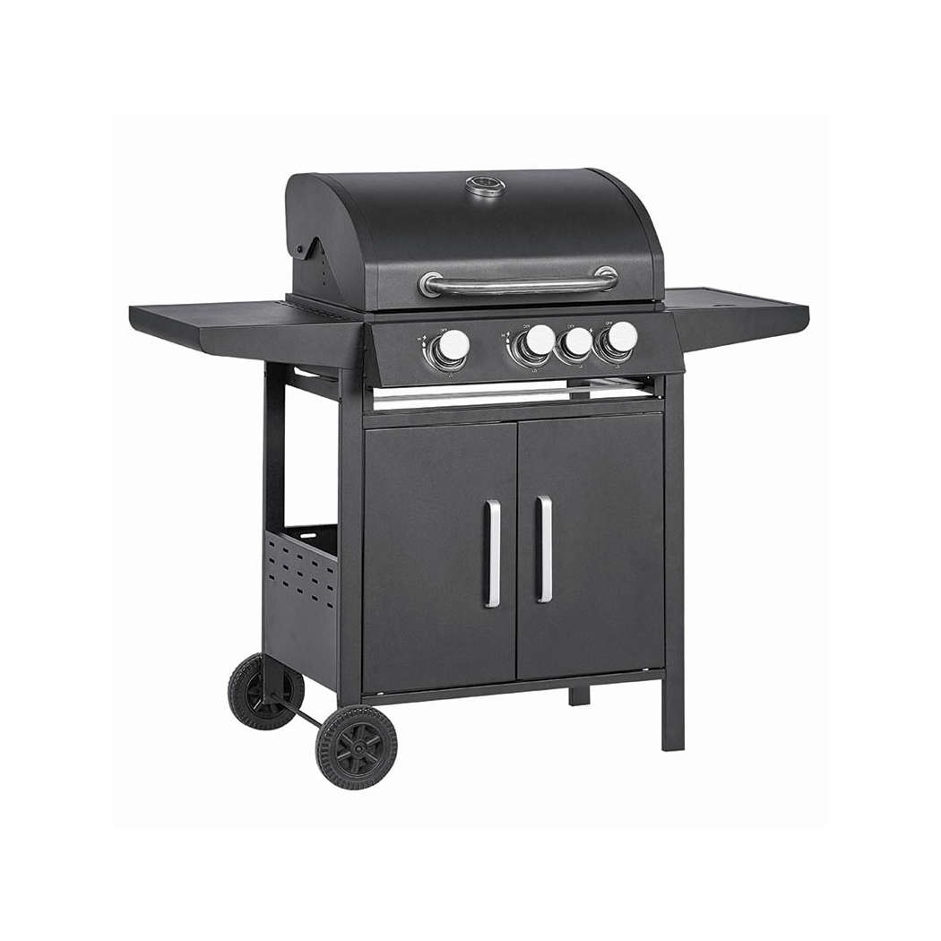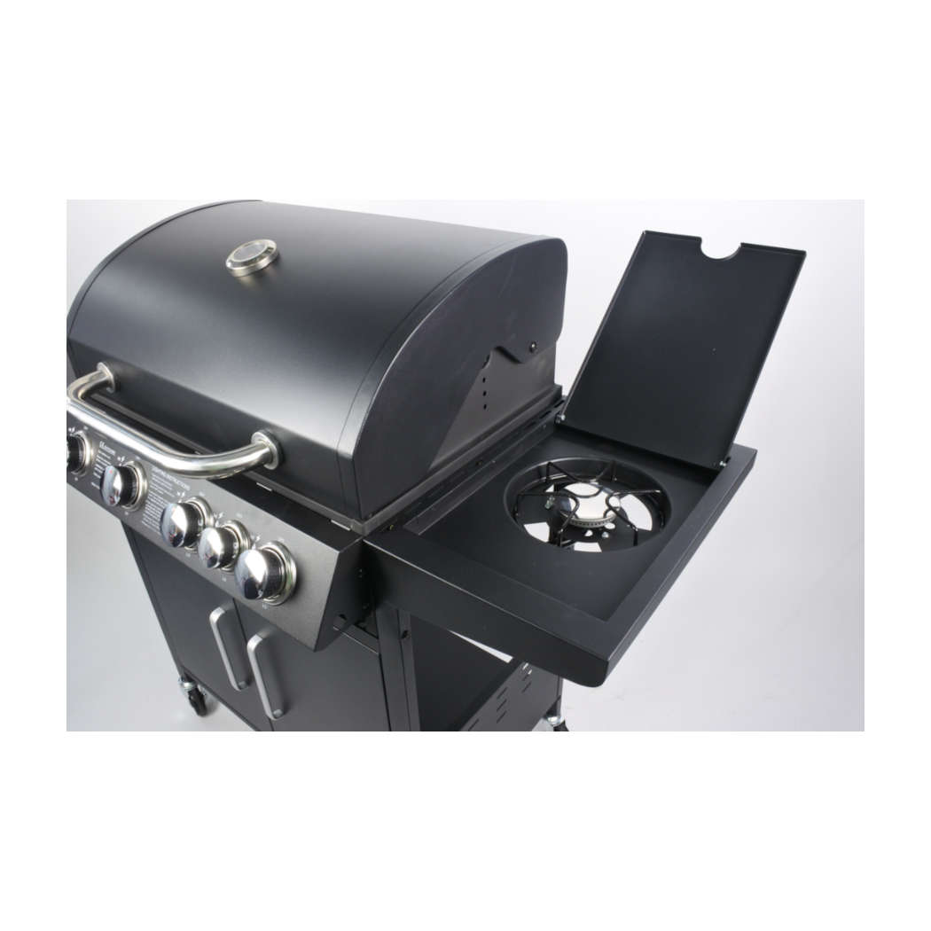 Ψησταριά Υγραερίου ELEMENT3+1 εστιών, με μαντεμένια σχάρα, ρόδες για εύκολη μεταφορά και μεγάλο θερμόμετρο στο καπάκι. Επίσης διαθέτει ντουλάπι, 2 ράφια στις πλευρές και πιεζοηλεκτρικό άναμμα εστιών.