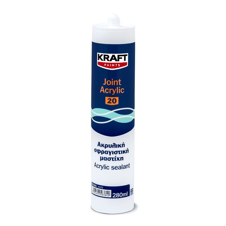 Το KRAFT JOINT ACRYLIC 20 είναι ένα πλαστοελαστικό σφραγιστικό ενός συστατικού ακρυλικής βάσης. Είναι ειδικά διαμορφωμένο για χρήση σε απορροφητικές, πορώδεις επιφάνειες εσωτερικών και εξωτερικών χώρων, όπως ανάμεσα σε παράθυρα και περβάζια, κάσες κουφωμάτων και τοίχους, ρωγμές κλπ. Είναι κατάλληλο για σφράγιση κάθετων συναρμογών καθώς και για αρμούς χωρίς μεγάλη λειτουργική μεταβολή πλάτους (μέχρι 8%). Παρουσιάζει εξαιρετική πρόσφυση σε τσιμέντο, τούβλο, ξύλο, αλουμίνιο και PVC. Ωριμάζει γρήγορα με την επαφή με τον ατμοσφαιρικό αέρα. Βάφεται με τα κοινά ακρυλικά και πλαστικά χρώματα μετά την πλήρη σκλήρυνσή του.