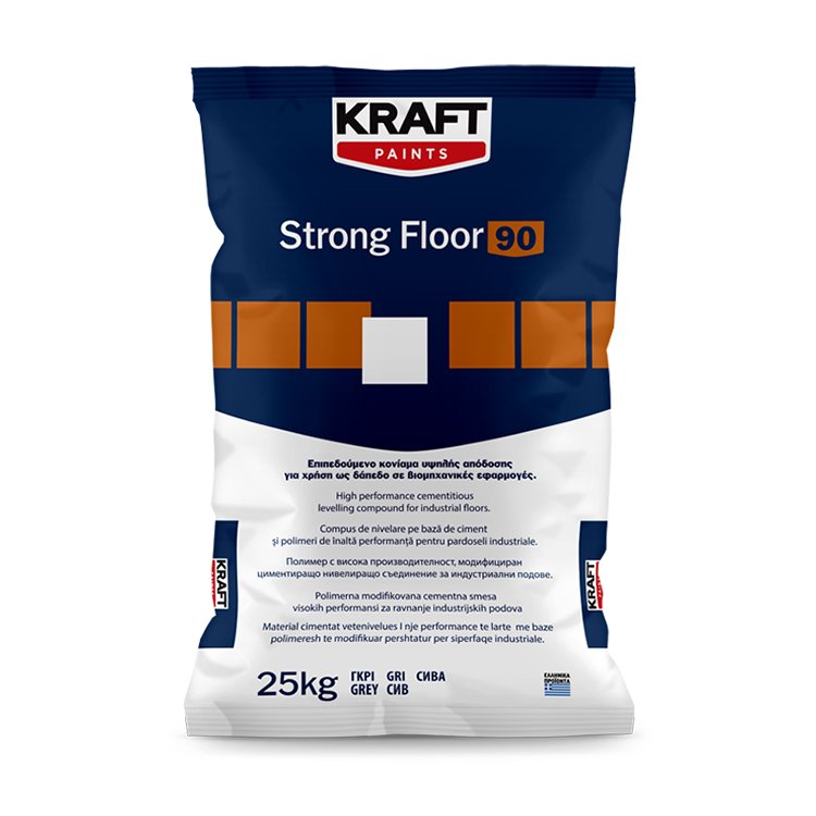 Το KRAFT Strong Floor 90 είναι ενός συστατικού υψηλής ρευστότητας επιπεδούμενο τσιμεντοειδές κονίαμα, τροποποιημένο με πολυμερή, κατάλληλο για χρήση ως δάπεδο σε βιομηχανικά κτήρια, σε δάπεδα υψηλής καταπόνησης (π.χ. χώροι στάθμευσης κλπ) και σε χώρους αστικού περιβάλλοντος (π.χ. πεζοδρόμια, ποδηλατόδρομοι κλπ). Επίσης, είναι κατάλληλο για χυτεύσεις και αγκυρώσεις. Μπορεί να εφαρμοστεί με το χέρι ή με αντλία για εξομάλυνση και επιπέδωση εσωτερικών και εξωτερικών δαπέδων σε πάχος 10-80mm. Λόγω του πολύ χαμηλού πορώδους μπορεί να χρησιμοποιηθεί ως τελική επίστρωση ή ως υπόστρωμα πριν την εφαρμογή εποξειδικών ή πολυουρεθανικών δαπέδων. Πληροί τις απαιτήσεις του ΕΝ 13813 (CT-C80-F15-A1,5), του ΕΝ 1504-3 (R4) και του ΕΝ 1504-6.