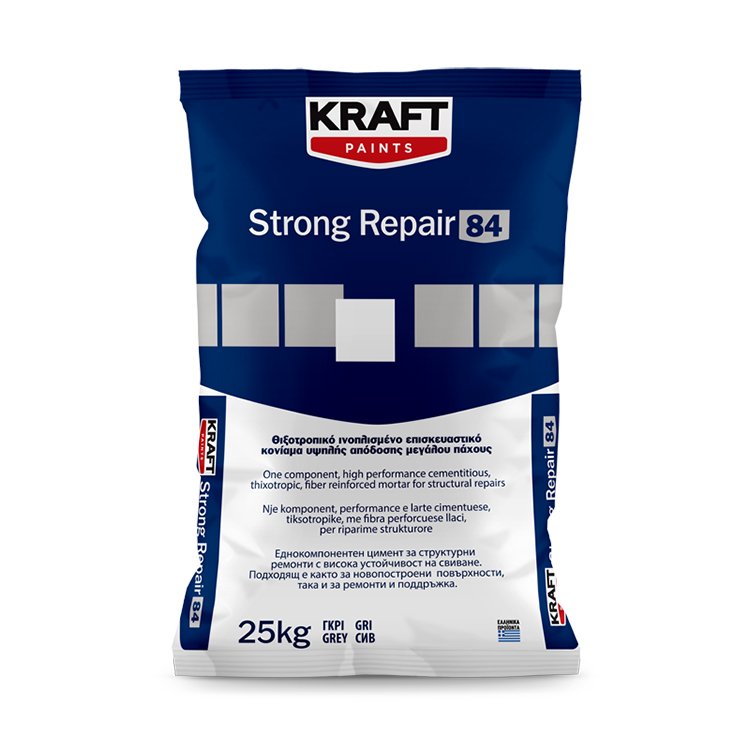 Το KRAFT Strong Repair 84 είναι ενός συστατικού γκρί θιξοτροπικό τσιμεντοειδές κονίαμα, τροποποιημένο με πολυμερή, κατάλληλο για χρήση ως υλικό επισκευής και αποκατάστασης κατασκευών από σκυρόδεμα και κονιάματα μεγάλου πάχους. Πληροί τις απαιτήσεις του προτύπου ΕΝ 1504-3 στην κατηγορία αντοχής R4. Μπορεί να εφαρμοστεί σε εσωτερικές και εξωτερικές, οριζόντιες και κατακόρυφες επιφάνειες. Το συγκεκριμένο προϊόν έχει σχεδιαστεί ειδικά για εφαρμογές κάτω από πλάκες και δομικά στοιχεία.