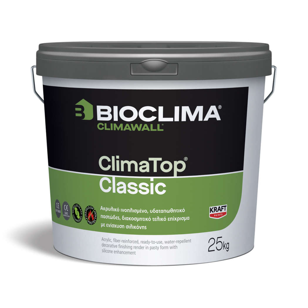 Το ClimaTop® Classic είναι ένα διακοσμητικό, έτοιμο προς χρήση, σε μορφή πάστας, οργανικό, ακρυλικό, ινοπλισμένο, διαπνέον τελικό επίχρισμα ενισχυμένο με σιλικόνη. Εμπεριέχει φυσικούς κόκκους κατάλληλης διαβαθμισμένης κοκκομετρίας, ίνες πολυπροπυλενίου, προσθετικές βελτιωτικές ουσίες και ελαφροβαρή μικροσφαιρίδια από 100% ανακυκλωμένο διογκωμένο γυαλί (Recycled Glass Technology) τα οποία βελτιώνουν περαιτέρω την εργασιμότητα, το τελικό φινίρισμα και τις μηχανικές αντοχές. Κατατάσσεται ως οργανικό επίχρισμα για εξωτερική και εσωτερική χρήση σε τοιχοποιίες κατά ΕΝ 15824 και συμμετέχει ως τελικό επίχρισμα στο πιστοποιημένο σύστημα εξωτερικής θερμομόνωσης τοιχοποιίας CLIMAWALL® της BIOCLIMA® κατά EAD 040083-00-0404.