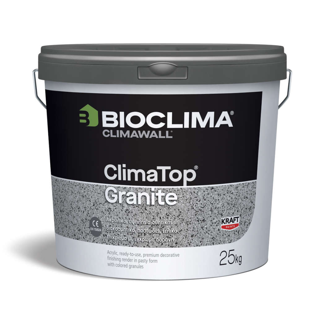 Το ClimaTop® Granite είναι ένα διακοσμητικό, έτοιμο προς χρήση σε μορφή πάστας, ακρυλικό τελικό επίχρισμα με έγχρωμα αδρανή. Προσδίδει ένα ιδιαίτερο τελικό αισθητικό αποτέλεσμα που προσομοιάζει την εμφάνιση γρανίτη. Κατατάσσεται ως οργανικό επίχρισμα για εξωτερική και εσωτερική χρήση σε τοιχοποιίες κατά ΕΝ 15824.