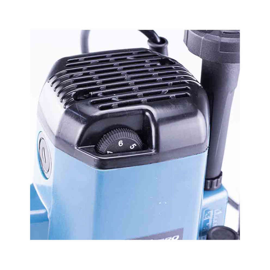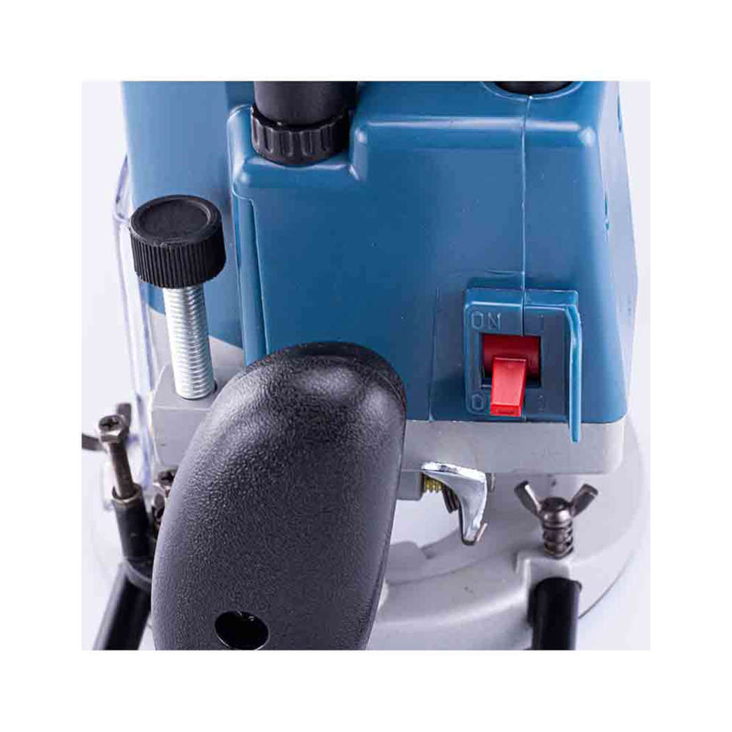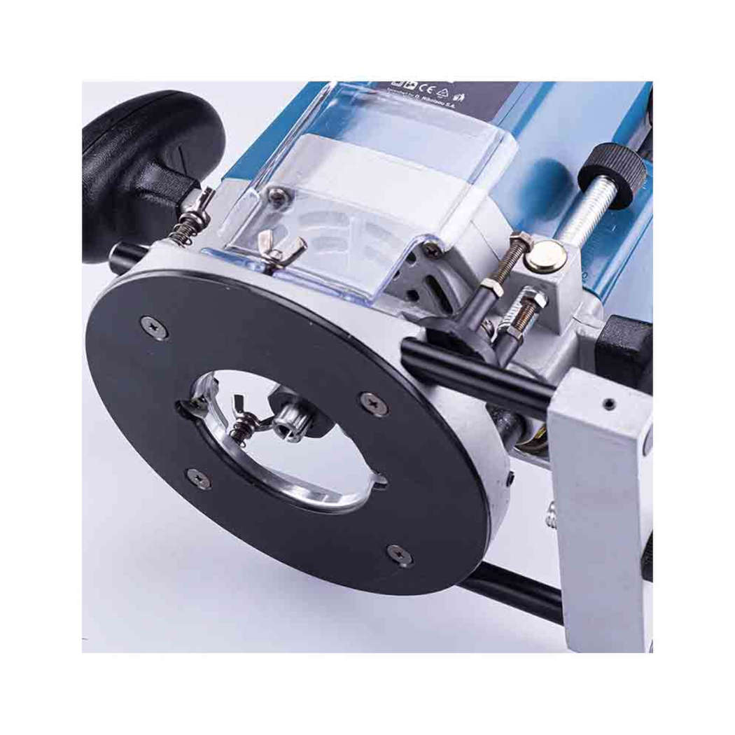 Ρούτερ με μηχανισμό κλειδώματος που εξυπηρετεί στη γρήγορη και εύκολη ρύθμιση βάθους και αλλαγή βάσης. Οι λαστιχένιες λαβές και ο σχεδιασμός χαμηλού κέντρου βάρους παρέχουν την καλύτερη άνεση, ισορροπία και μεγαλύτερο έλεγχο από το χρήστη. Διαθέτει ρυθμιζόμενους οδηγούς για ακριβής κοπές.