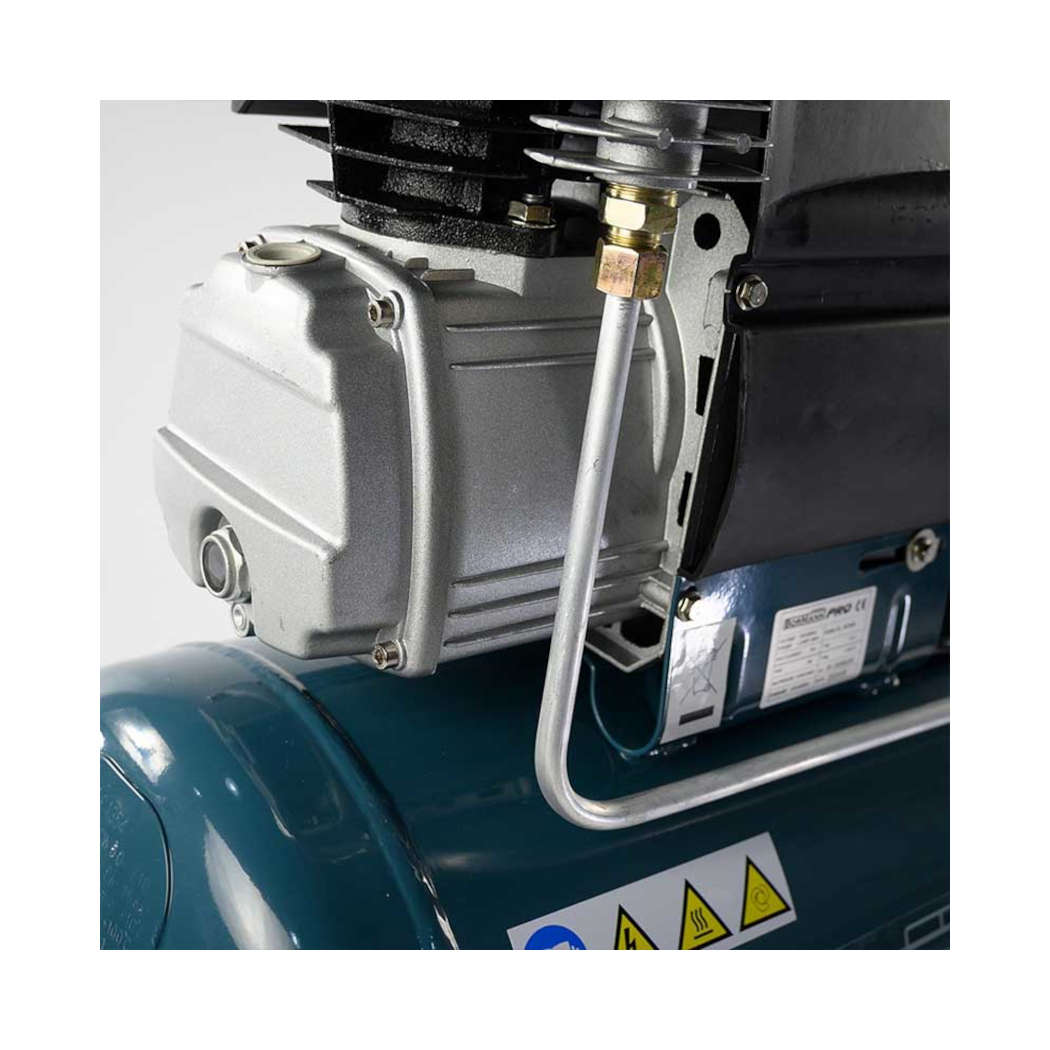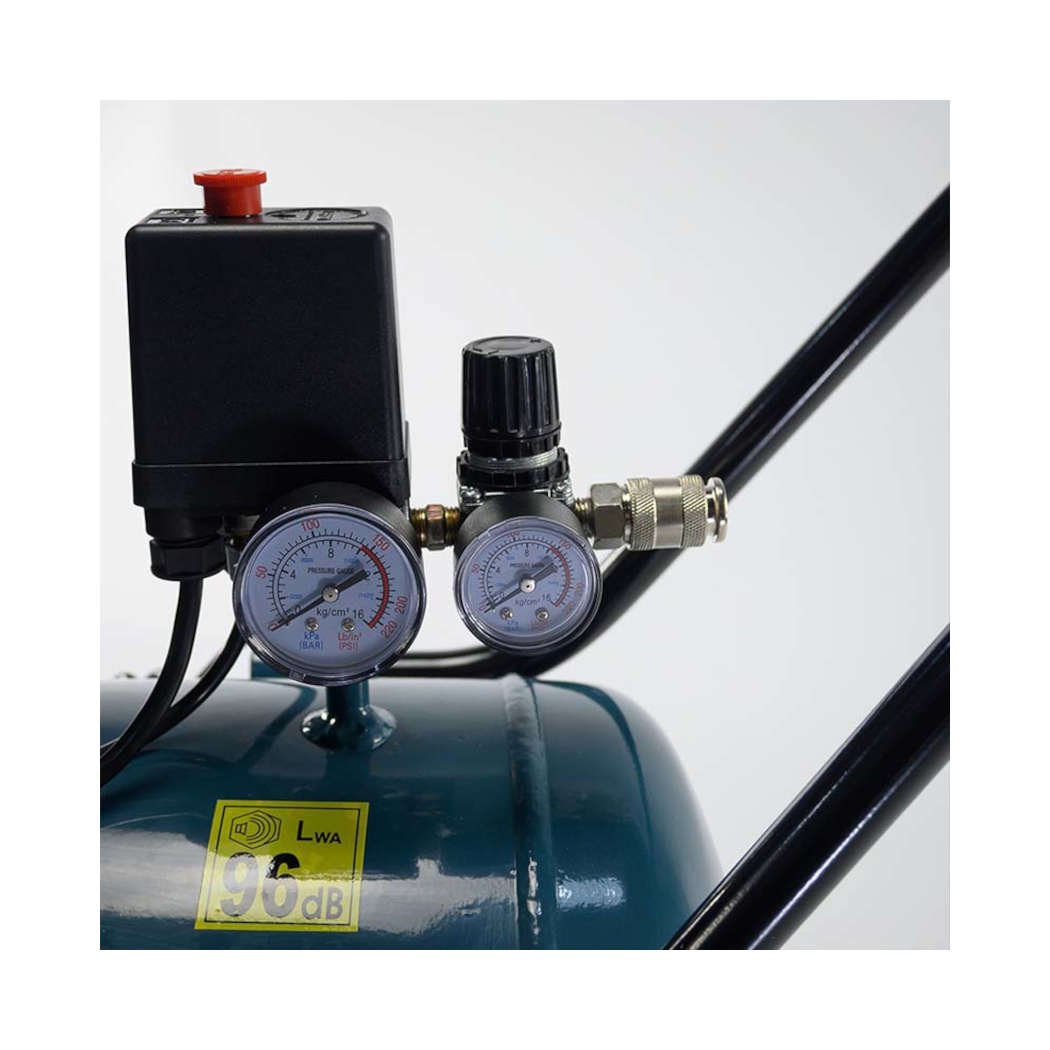 Αεροσυμπιεστής με δυνατό κινητήρα αλουμινίου μονομπλόκ με λάδι με δυνατότητα μεγάλης παροχής αέρα. Έχει ενσωματωμένα δύο μανόμετρα για ένδειξη πίεσης αέρα καζανιού και εξόδου. Για κάθε χρήση εργαλείων αέρος, θα εξυπηρετήσει και τους πιο απαιτητικούς χρήστες. Το ελαφρύ καζάνι του σε συνδυασμό με την εργονομική λαβή και το σετ τροχών που φέρει, το καθιστούν εύκολο στη μεταφορά.