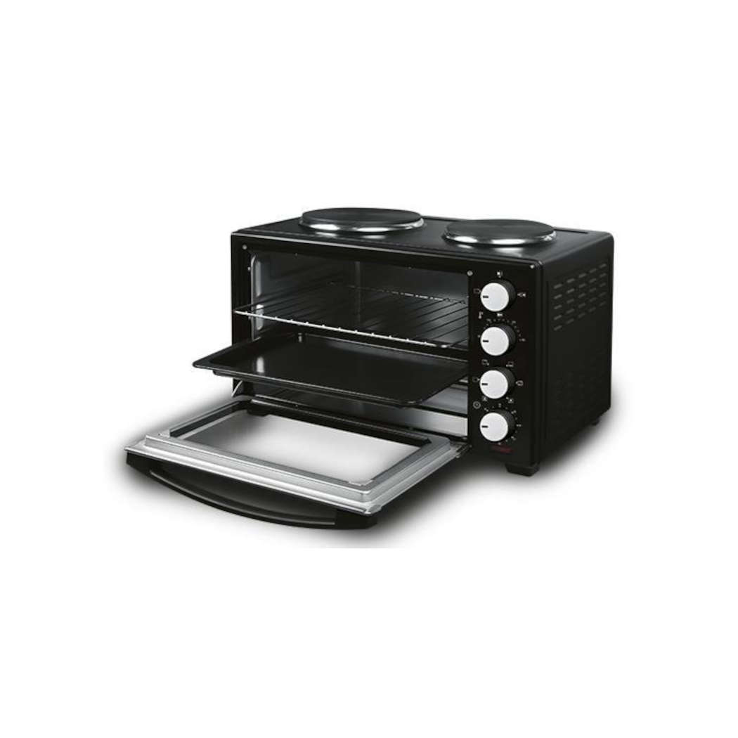 Ηλεκτρικό φουρνάκι 3200W, χωρητικότητας 38lt και 2 εστίες μαύρου χρώματος. Ιδανικό για φοιτητές η άτομα που δεν έχουν μεγάλους χώρους μαγειρέματος. Διαθέτει χρονοδιακόπτη 90 λεπτών, 2 εστίες διαμέτρου Φ18 και Φ15 με απόδοση στα 1000W και 600W αντίστοιχα, διπλό γυαλί στη πόρτα για καλύτερο μαγείρεμα και 5 λειτουργίες ψησίματος. Περιλαμβάνονται ταψί 29.5 x 38.5cm, ταψί διαμέτρου Φ31, σχάρα και χειρολαβή. Καθαρό βάρος 10.1kg και εγγύηση 2 χρόνια by Eurolamp.