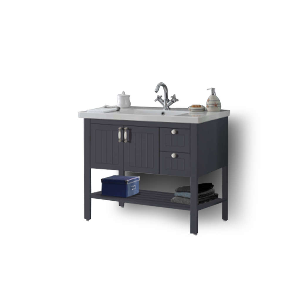 Επιδαπέδιος πάγκος με ποδαράκια σε ματ ανθρακί λάκα. Περιλαμβάνει μεγάλο ερμάριο και ένα επιπλέον ράφι στη βάση του πάγκου. Προσφέρει εργονομία και λειτουργικότητα στην καθημερινότητά σας.