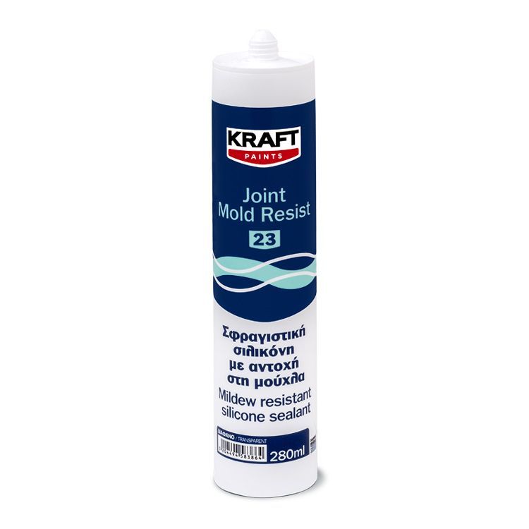 Η KRAFT MOLD RESIST 23 είναι μία σιλικόνη όξινου τύπου ενός συστατικού. Είναι κατάλληλη για σφράγιση και συγκόλληση κατασκευών από γυαλί, πορσελάνη (πλακίδια, κλπ.), μη πορώδη κεραμικά. Παρουσιάζει άριστη πρόσφυση σε βερνικωμένο ή βαμμένο ξύλο και πολλά πλαστικά όπως εποξειδικά,πολυεστέρα κ.α.