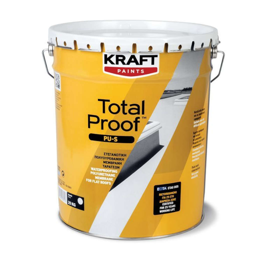 Το KRAFT TOTAL PROOF PU-S είναι μία επαλειφόμενη, ελαστική μεμβράνη πολυουρεθάνης, βάσεως διαλύτου ενός συστατικού που στεγνώνει με την υγρασία της ατμόσφαιρας και χρησιμοποιείται για στεγανοποίηση και προστασία δομικών επιφανειών και κατασκευών μακράς διαρκείας. Είναι κατάλληλο ακόμα και στις πιο απαιτητικές εφαρμογές σε ταράτσες, μπαλκόνια και εφαρμογές κάτω από πλακάκια. Σχηματίζει μια ενιαία μεμβράνη χωρίς ενώσεις μεγάλης ελαστικότητας. Παρουσιάζει άριστη πρόσφυση σε όλα τα υποστρώματα με χρήση κατάλληλου ασταριού και αντοχή σε μηχανικές, θερμικές και χημικές καταπονήσεις. Διατηρεί τις μηχανικές του ιδιότητες σε θερμοκρασίες από -30oC έως +90oC. Λόγω της πολυουρεθανικής του σύστασης δεν υδρολύεται και έχει μεγάλη αντοχή στα στάσιμα νερά και τον πάγο. Επιτρέπει τη χρήση της επιφάνειας όταν συνδυαστεί με εφαρμογή κατάλληλου υλικού προστασίας όπως το KRAFT TOTAL PROOF TOP COAT. Πληροί όλες τις προϋποθέσεις και έχει ελεγχθεί κατά το ευρωπαϊκό πρότυπο ETAG 005 από τον ΕΟΤΑ (ΕΤΑ-16/0484).